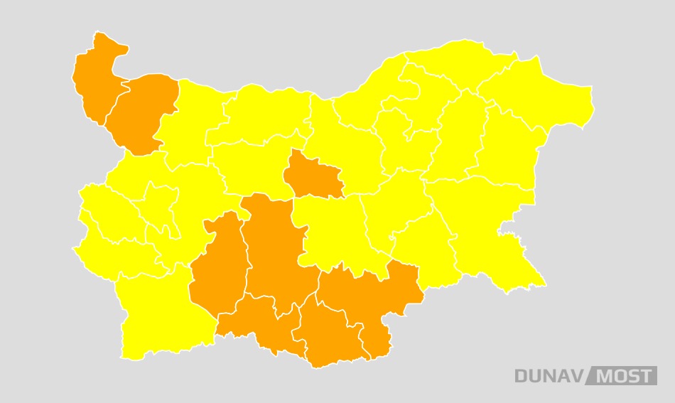 Предупредителен код от втора степен (оранжев) е в действие за осем области на страната: Видин, Монтана, Габрово, Пловдив, Смолян, Пазарджик, Кърджали и Хасково. В тези региони се чакат обилни превалявания, като в по-голямата част дъждът ще минава в сняг, и ще се образува снежна завивка.
