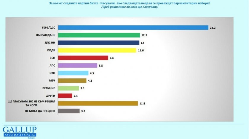 Осем партии биха влезнали в Народното събрание, в случай че идната неделя се проведат избори. ГЕРБ биха били първи с 22,2%, за второто място в Народно събрание биха се борили " Възраждане " (с 12,1% подкрепа) и " ДПС-Ново начало " (с 12,0%), следвани компактно от " Продължаваме промяната - Демократична България " (с 11,6%).