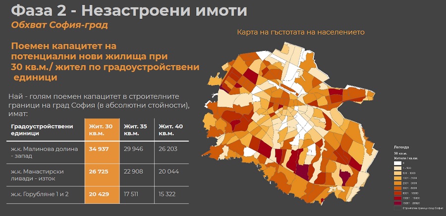 Още един милион души може да живеят в София като употребяват съществуващия сграден фонд или евентуалните нови жилища във към момента незастроени територии. Жилищният потенциал на столицата е за към 2.45 млн. души. При последното броене в града е имало 1.325 млн. поданици.
