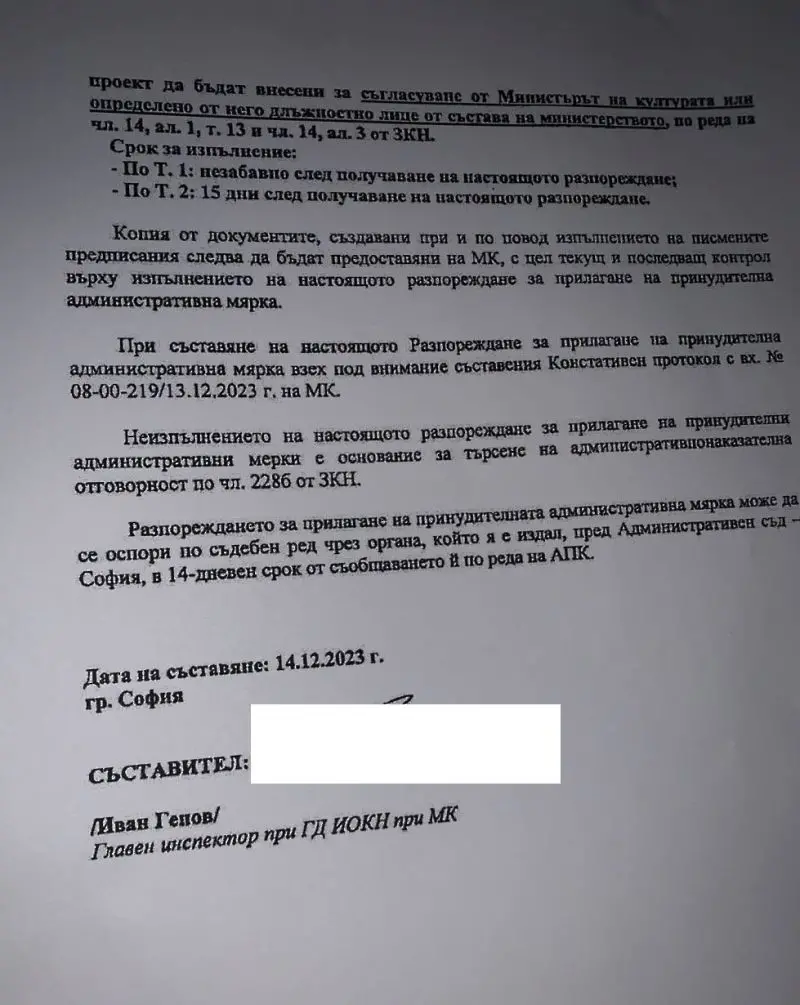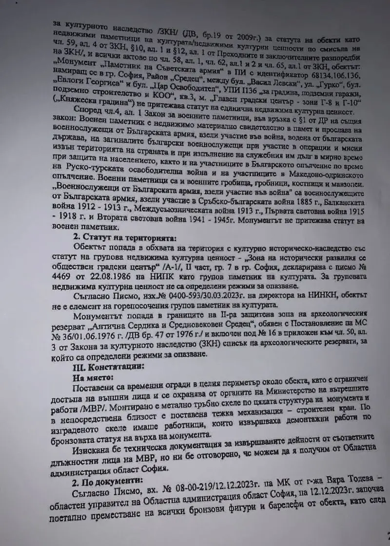 " Тези дейности от страна на Областната администрация не са просто безчинство, това е превишаване на длъжностните права и корист с държавни средства. Документът, публикуван от Инспектората към Министерство на културата, беше крит от общественоста в продължение на два дни, с цел да не стопират да безчинстват върху монумента. "
