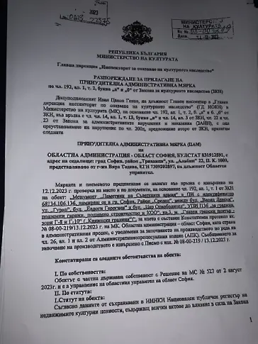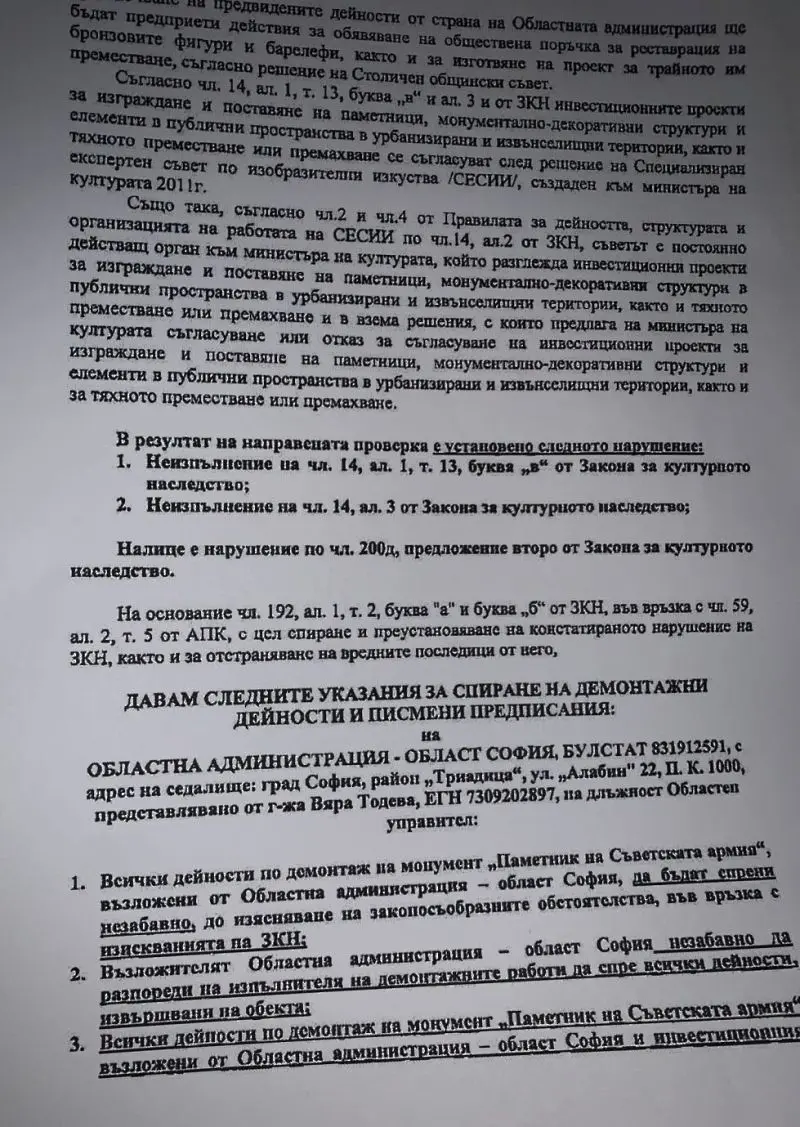 " Това излиза наяве от формален документ " Разпореждане за използване на насилствена административна мярка по член 192, алинея 1, т. 2, писмен знак " а " и " б " от Закона за културното завещание, подписано от основен контрольор Иван Генов. С това предписание е наложена насилствена административна мярка, за която законът планува авансово осъществяване, т.е. още в четвъртък е трябвало да бъдат прекъснати всички действия по рязането на монумента. Това обаче не се случи и в нарушаване на закона в петък беше отрязана и свалена част от още една от фигурите. Скандална е арогантността, с която от Областната администрация не се преценяват със законите в страната. Потресаващо е хладнокръвието, с което правят това закононарушение пред очите на цяла България. Абсурдно е държавна институция да нарушава законите в страната " - съобщи ръководителят на Българска социалистическа партия - София.