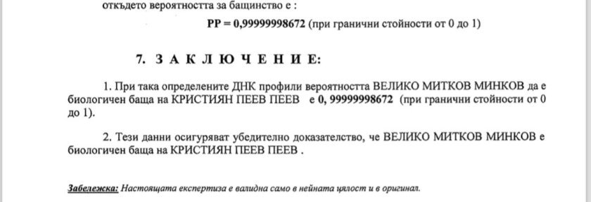 " Тестът демонстрира извънредно безапелационно, че аз съм бащата на детето, като в случай че би трябвало да го изразим в проценти това е 99 % с още 9 9-ки след запетайката и една 8-ца, тъй че по-убедително от това не може да бъде ", сподели Велико Минков, татко на дребното дете на Габриела.