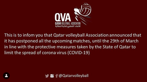 Коронавирусът спря още едно състезание, много по- на изток. В Катар локалната волейболна асоциация разгласи прекъсването на срещите от Лигата и всички други действия до второ разпореждане. Тимът на Ал Араби (Доха), чийто цветове пази българският посрещач Валентин Братоев , е водач в класирането с 44 точки (15 победи, 2 загуби).