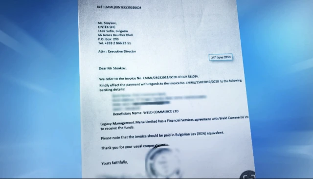 bTV получи от свои източници това писмо от юни 2019 година. Изпращач е Самюел Ападу, управител на дубайската " Легаси Мениджмънт Мена Лимитид ". Тук, той моли " Кинтекс " да преведе сумата от 56 000 евро по сметка на българската компания " Уелд Комерс ".