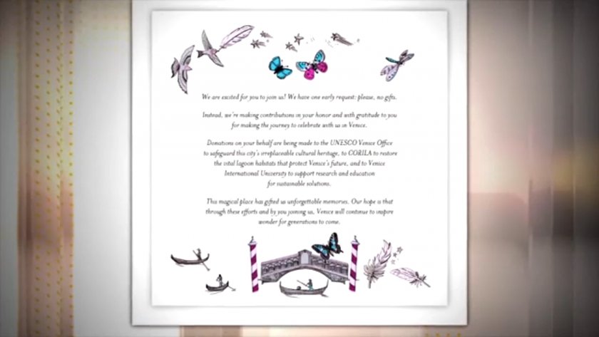 Част от формалната покана, получена от ABC News, съдържала предварителното предпочитание на двойката: „ апелирам, без дарове “. Вместо това в нея се посочвало, че Безос и Санчес ще създадат дарения „ с признателност “ от името на гостите си за дела, в това число Международния университет във Венеция и организация, отдадена на възобновяване на лагуните на града.