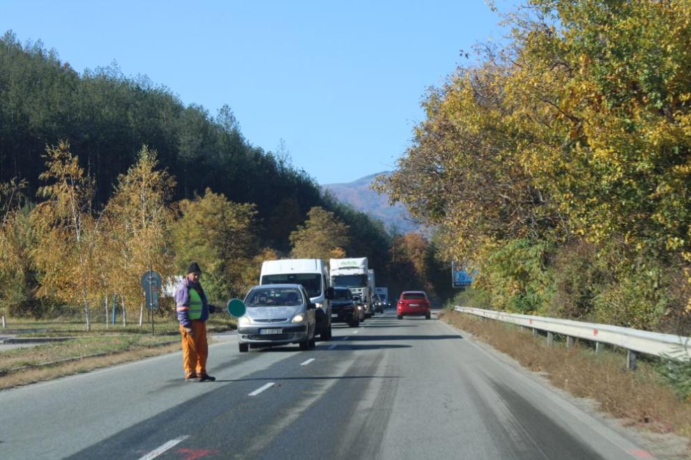Движението в сектора от Симитли до махала Марево на село Градево е извънредно затруднено. Интензивният трафик на няколко места се прави единствено в едната пътна лента, контролира се от сигналисти.