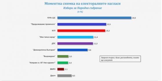 Ако изборите за Народно заседание бяха в края на първата десетдневка на ноември, ГЕРБ биха получили 23,5% от вота, „ Продължаваме промяната “ и Българска социалистическа партия са с равни шансове - надлежно с 15,5% и 15,2% . „ ИТН “ се употребява с 11,4% електорална подготвеност, Движение за права и свободи – 11,3% , „ Демократична България “ – 9,6% . 3,5% от възнамеряващите да гласоподават показват „ Възраждане “ , 3,4% – „ Изправи се, България! Ние идваме “ , Вътрешна македонска революционна организация – 2,1% . 4,5% ще предпочетат други варианти.