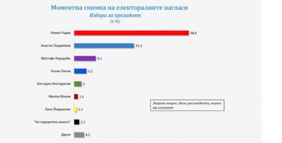 Ако президентските избори бяха в края на първата десетдневка на ноември, 48,6% биха дали своят вот за Румен Радев , 25,3% – за Анастас Герджиков , 9,1% – за Мустафа Карадайъ , 5,2% – за Лозан Панов , 3% – за Костадин Костадинов , 1,5% за Милен Михов . 1,1% споделят, че ще гласоподават за Луна Йорданова. 2,1% споделят, че ще гласоподават с „ Не поддържам никого “ . 4,1% ще предпочетат други варианти .