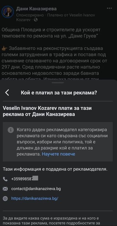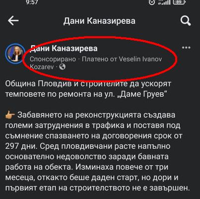 Така стигаме до втората специфичност на пловдивската политика. Публикацията на Дани Каназирева е спонсорирана във Facebook,не от какъв да е, а от самия Веселин Козарев. Директорът, който е и деятел на „ Съюз за Пловдив” и платил този пост да стигне до допустимо повече хора в Пловдив, с цел да схванат за „ признака на безхаберието " в Пловдив.