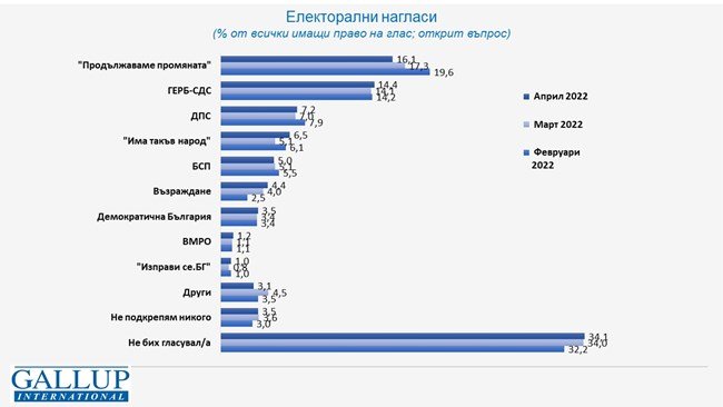 Моментната картина на електоралните настройки е от последната вълна на постоянната самостоятелна стратегия на ежемесечни проучвания, позната като Политически и стопански показател на „ Галъп интернешънъл болкан “.