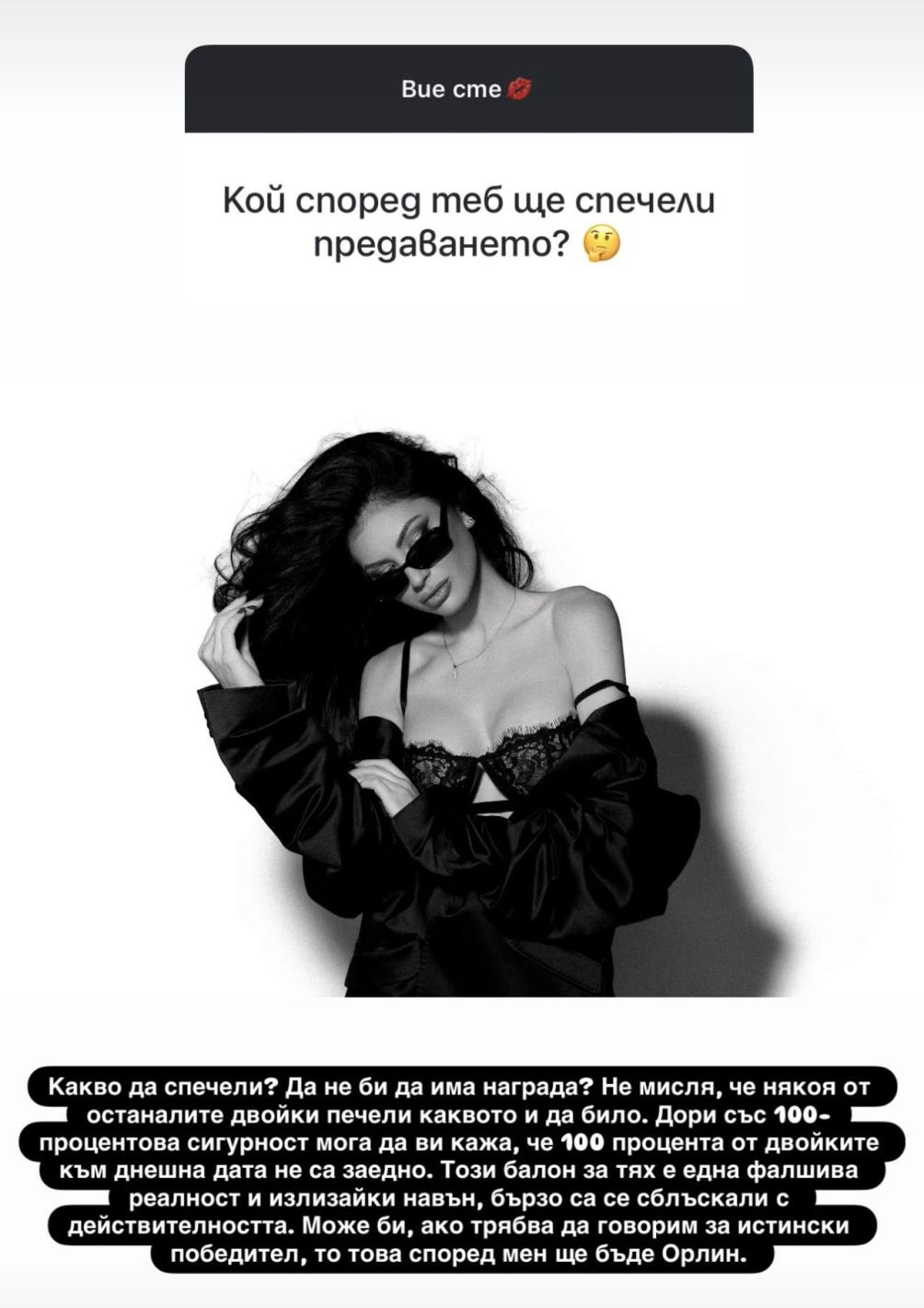 Според фолк дивата нито една от двойките финалисти не е останала дружно към днешна дата. „ Този балон за тях е една подправена действителност и излизайки на открито, бързо са се сблъскали с действителността “, уверена е Венцислава. Все отново за нея същинският победител в „ Ергенът: Любов в парадайса “ е кметският наследник Орлин, написа Intrigi.bg.