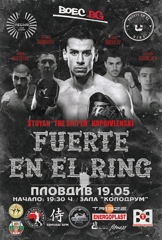 Впечатление също по този начин вършат и имена като Стоян Копривленски, Атанас Божилов, Богдан Шумаров, Александър Петров, Християн Корунчев, Йордан Янков, Христомир Ранчев и още и още. Очакват се доста специфични посетители обичани от цяла България и несъмнено страхотна атмосфера за всички фенове на бойните спортове в България! Билети ще може да си закупите на място преди началото на събитието от касите на залата! Fuerte EN EL Ring - 19 май, зала " Колодрум ", 19:30 ч.
