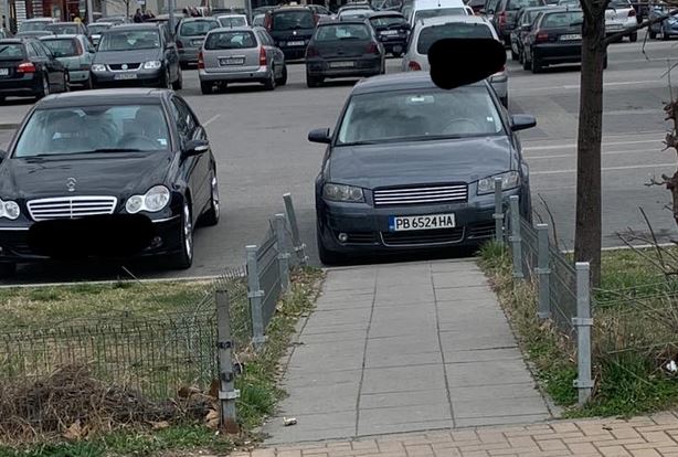 " Ето и следващия съгражданин с невисок умствен капаците. Това е на паркинка на хипермаркет в кв. " Смирненски ". Изхода към градинката е изцяло запушен.