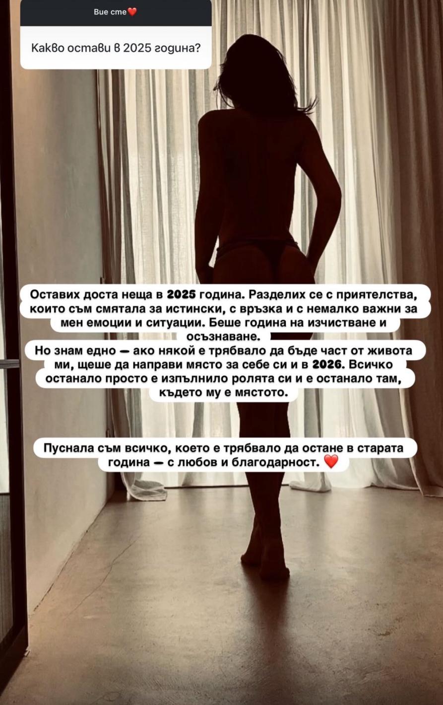 „ Оставих много неща в 2025 година. Разделих се с другарства, които съм считала за същински, с връзка и с значително значими за мен страсти и обстановки. Но знам едно - в случай че някой е трябвало да бъде част от живота ми, щеше да направи място за себе си и в 2026. Всичко останало просто е изпълнило ролята си и е останало там, където му е мястото. “
