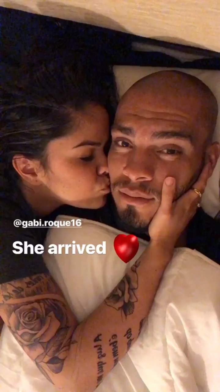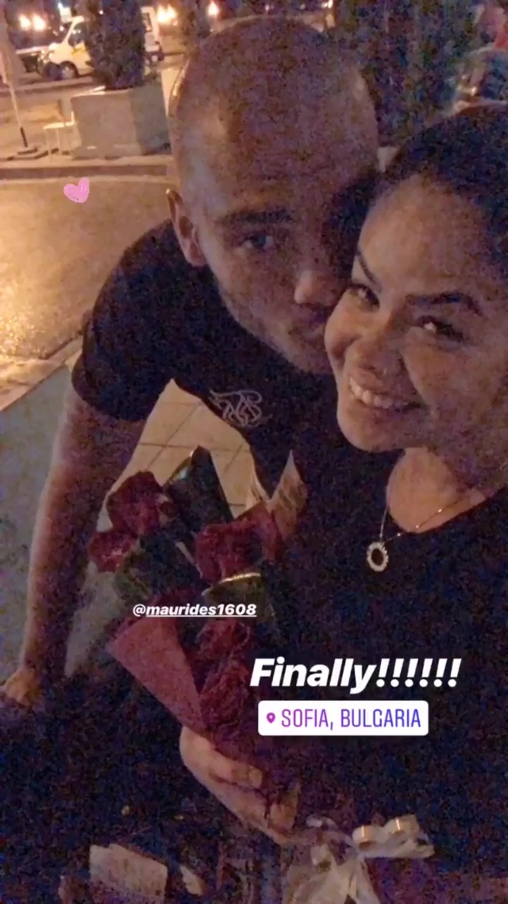 Габи дойде преди ден, а нападателят на ЦСКА-София я посрещна на летището с букет червени рози. След това той разгласява стори в обществените мрежи, на което двамата се гушкат в леглото.