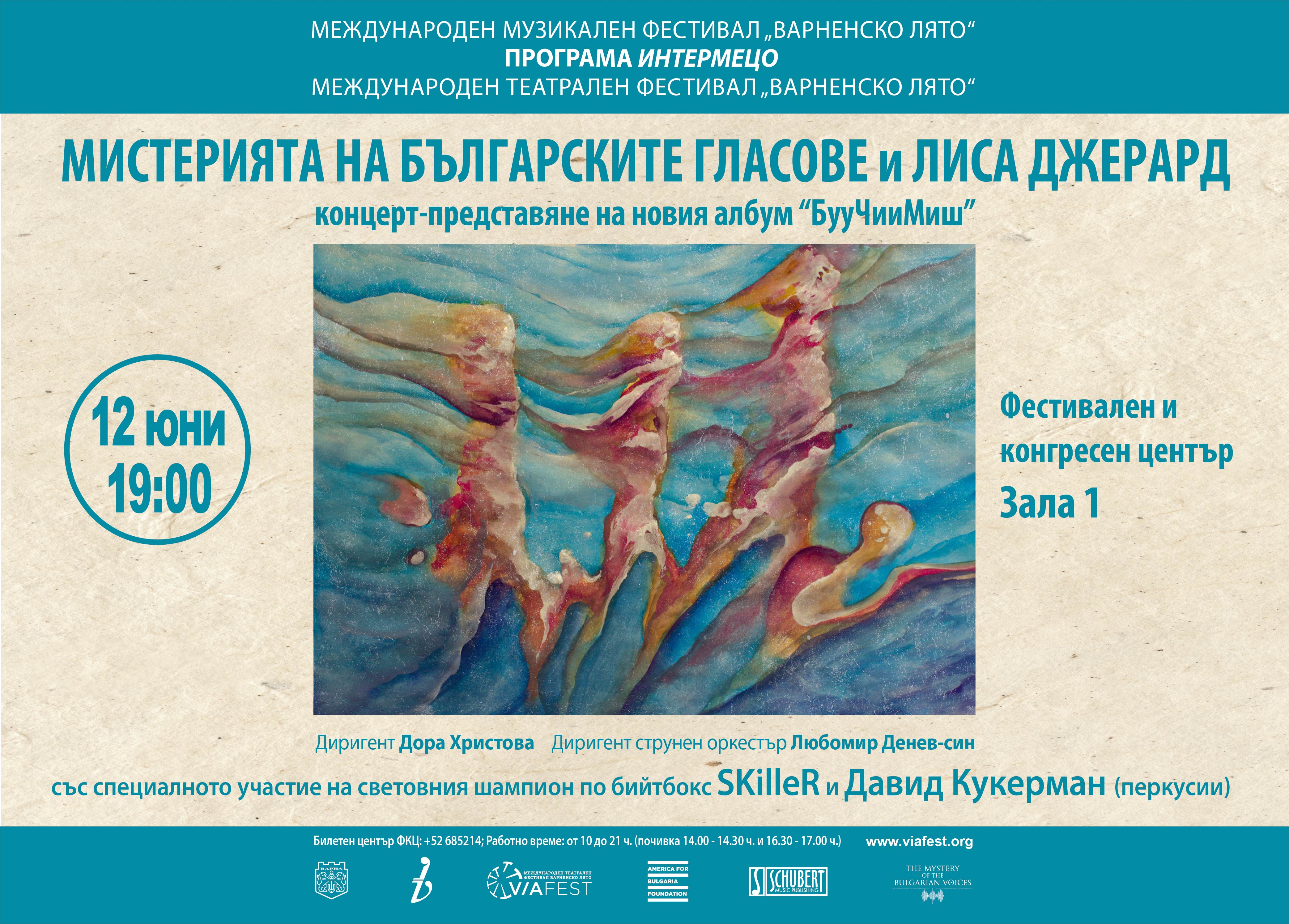 За своето 26. издание фестивалът задълбочава съдействието си с Международния музикален фестивал „ Варненско лято “, взаимно с който осъществя програмата „ Интермецо “ . В нейните рамки за първи път във Варна ще се показа едно извънредно съдействие в музикалната сцена през днешния ден – сред неповторимия вокален хор „ Мистерията на българските гласове “ и един от най-големите гласове в известната музика Лиса Джерард . Световноизвестната певица от дуото „ Дед Кен Денс “, носителката на премията „ Златен глобус “ за музика (за кино лентата „ Гладиатор “, основана взаимно с композитора Ханс Цимер), е специфичен посетител на хора в техния нов албум „ БууЧииМиш “. Той излиза публично в целия свят на 25 май с продуцент Шуберт Мюзик Пъблишинг. Концертът във Варна ще е неговото първо театрално показване в България. Първият сингъл от албума " PoraSotunda " беше публикуван през декември 2017 година и публично показан в ефира на BBC. Албумът съдържа още истински композиции и преработки на фолклорни мелодии, основани от композиторите Петър Дундаков, Лиса Джерард и Джулс Максуел, които ще могат да се чуят онлайн. На сцената ще излязат още международният първенец по бийтбокс – SkilleR и немският перкусионист Давид Кукерман дружно с изтъкнати български музиканти и струнен оркестър от Варна с диригент Любомир Денев-син. Концертът ще е 12 юни от 19 ч. в зала 1 на Фестивалния и конгресен център – Варна.