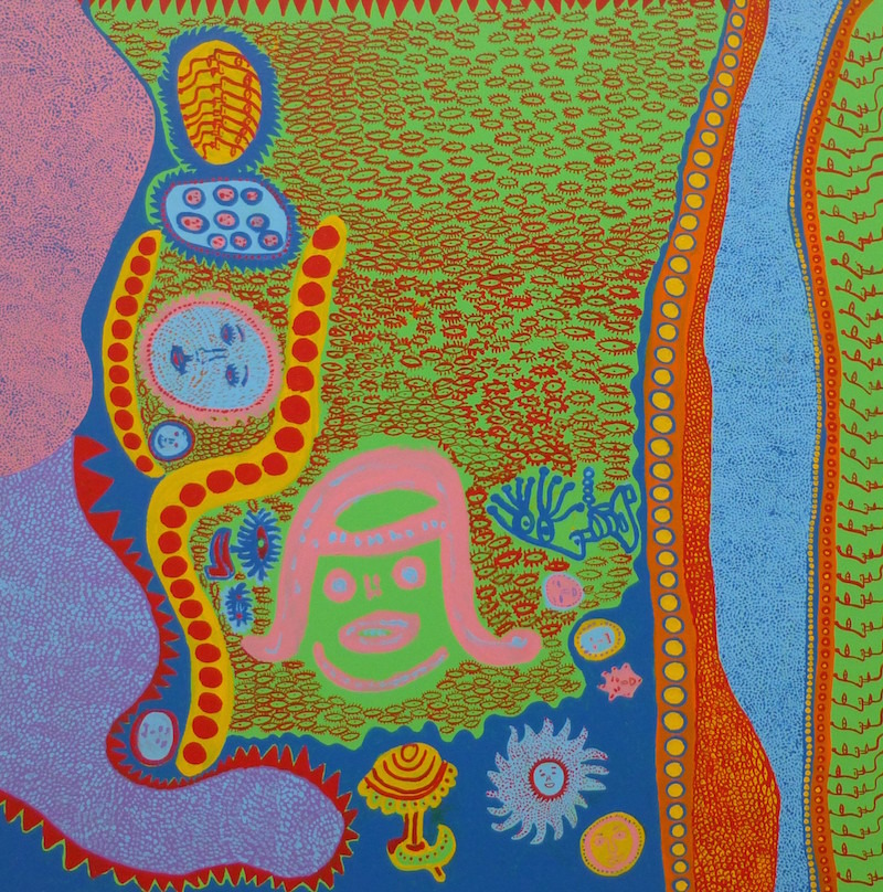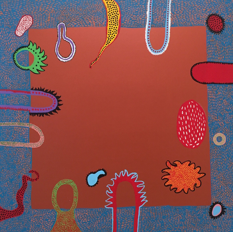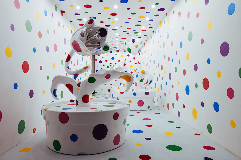 От 10-годишна Яйои Кусама рисува точки. Родителите й са богати и консервативни японци, които я малтретират физически и душевен. Разбира, че нещо не е наред, когато цветята стартират да получават човешки лица, когато животните стартират да й приказват, а орнаментите върху покривката - да се развъждат до безконечност. Намира избавление в рисуването. Рисува точки, точки, точки... до безконечност. Стандартните платна не й стигат, постоянно точките излизат отвън картината, покриват пода, стените, облеклата й, всичко към нея. Чрез непрекъснатото повторение на едно и също деяние укротява лудостта си и заглушава халюцинациите.