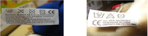 Тези играчки би трябвало наложително да имат инструкции за метода на почистването им. Например меките пълнени играчки би трябвало да имат трайно прикачен към шева на играчката етикет с нанесени знаци както е показано по-долу.