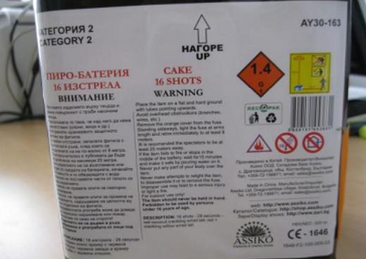 ► Върху опаковката на фойерверка би трябвало да е обозначено името на производителя/вносителя и неговият адрес, както и чистото еквивалентно количество взривно вещество в изделието;