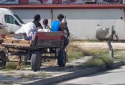 На фрагменти, публикувани в обществената мрежа Фейсбук, се виждат мъж, жена и дете, пътуващи умерено, теглени от конче.