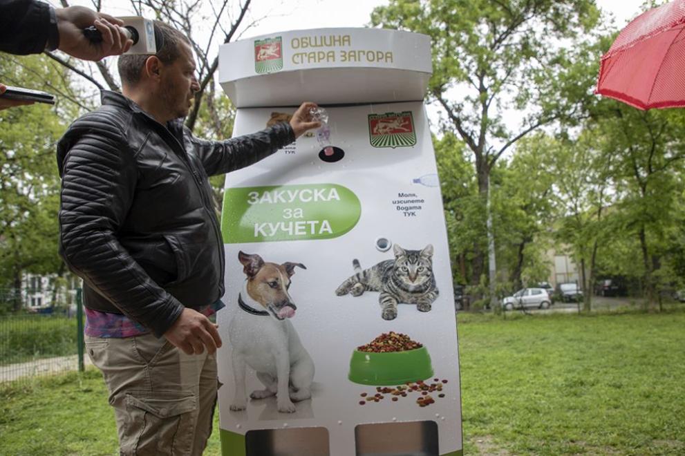 От 3 май в Стара Загора са сложени и работят вендинг машини , които против празна пластмасова бутилка дават порция храна за домашния любим . Иновативната облага беше показана от зам.-кметът Йордан Николов.