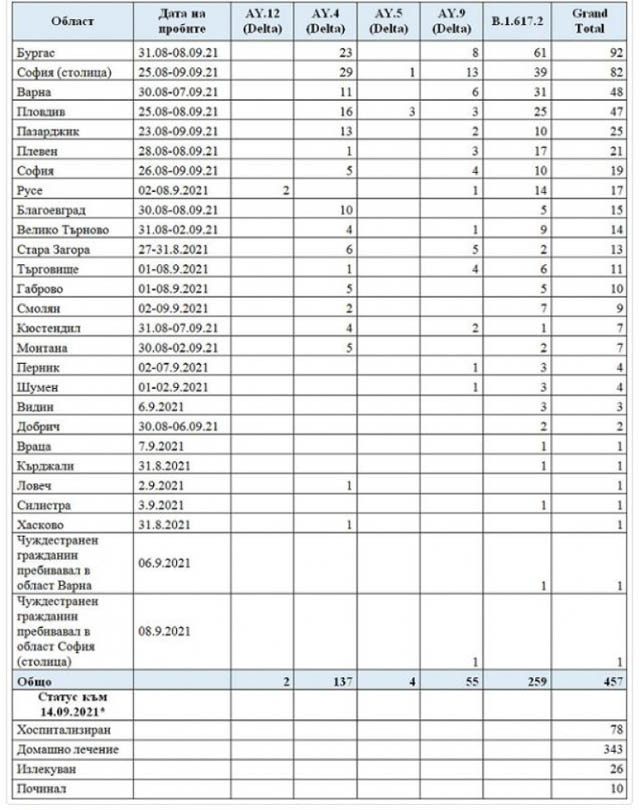 От 457 оценени клинични проби при всички е бил открит този вид на вируса На 100 % е превъзходството на „ Делта “ разновидността на Covid-19, оповестяват от Министерството на здравеопазването. От ведомството се базират на данни на Националният център по заразни и паразитни заболявания, който проучва посредством целогеномно секвениране 457 клинични проби със SARS-CoV-2. При всички проби е открит „ Делта “ разновидността, прочут като Индийски вид. Световната здравна организация причислява този вид към разновидностите с нараснало значение за публичното здраве. Клиничните проби са взети от пациенти с COVID-19 в интервала от 23 август до 9 септември. Изпратени са от 50 разнообразни лечебни заведения, от 26 области на страната. В таблицата по-долу можете да видите подробна информация за откритите случаи: