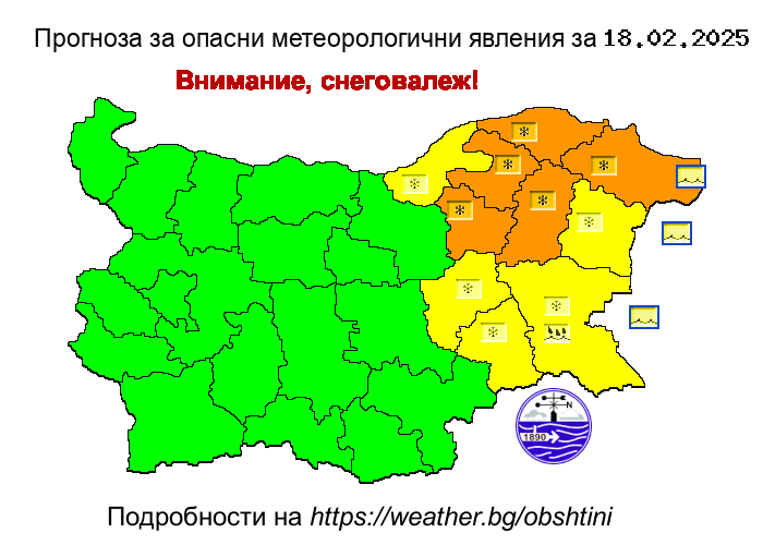Заради студа в сряда е разгласен жълт и оранжев код за ниски температури в Източна България. Там се чакат нови 10-15 см сняг. В 7 общини ще има нова завивка от 30 см. Минималните температури ще спаднат до -14 градуса. Има заплаха от премръзване.