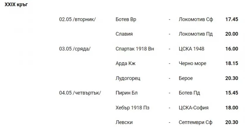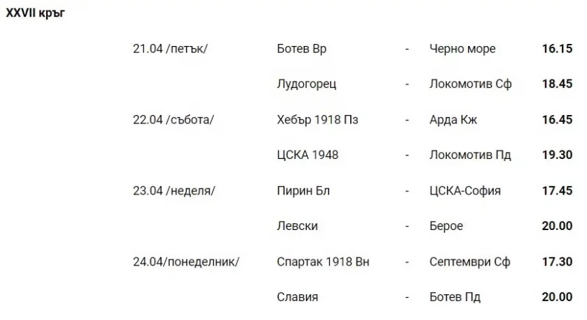 Спортно-техническата комисия разгласи програмата за четири кръга на efbet Лига. Битката за купата сред ЦСКА и Лудогорец ще се играе на 30 април, неделя, от 20:15 часа на " Българска войска ".