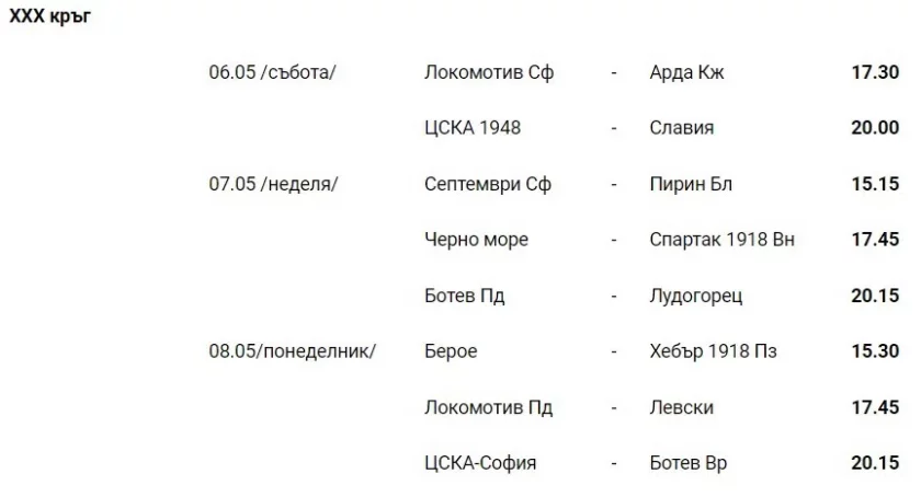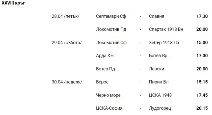 От Българския футболен съюз оповестиха програмата за efbet Лига за четири кръга напред. Дербито на върха сред ЦСКА и Лудогорец ще се играе на 30 април, неделя от 20:15 на стадион " Българска войска ".