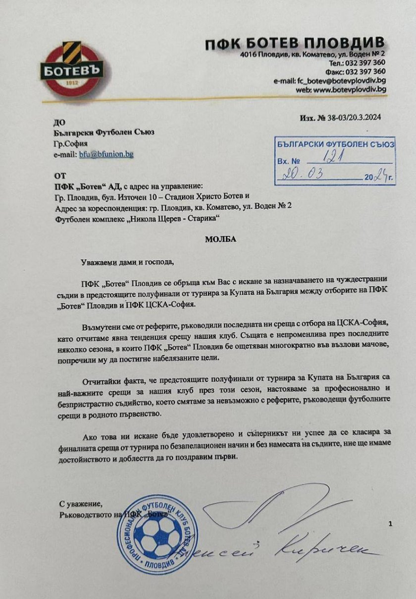 От Ботев Пловдив изпратиха публично молба до деловодството на БФС, с която желаеха задгранични рефери да управляват идните два полуфинални конфликти на „ канарчетата “ с ЦСКА. Двата тима се изправят един против различен в спор за място на финала на 17 април и 1 май.