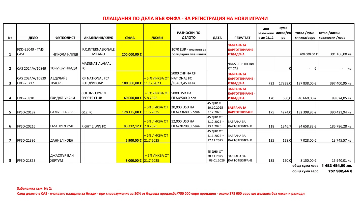 От клуба разгласиха и таблица с всичките отговорности и възбраните на ФИФА.