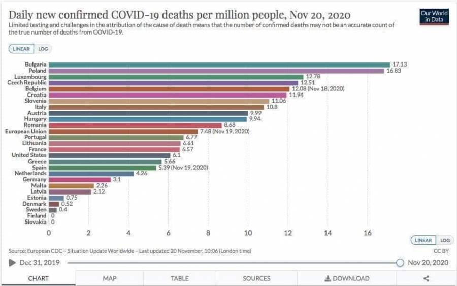 Това сочи и графика от уеб страницата OurWorldInData, като за информация паралелно с 27-те страни от Европейски Съюз са оставени и Съединени американски щати, прословути със своето несправяне с епидемията.