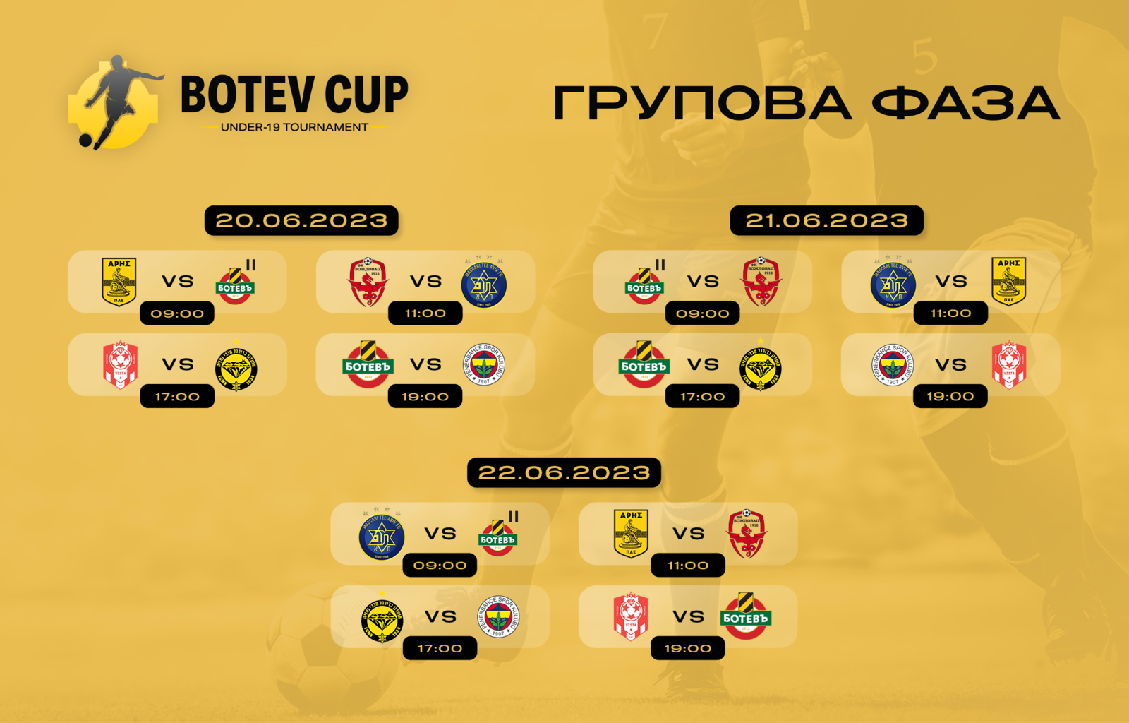 От през днешния ден до 25 юни Ботев ще бъде хазаин на доста мощен интернационален шампионат в U19. Мачовете ще се играят въз основата на отбора в Коматево. Това е първо издание на Botev Cup 2023, а от клуба считат да създадат шампионата обичаен и да се организира всяка година.