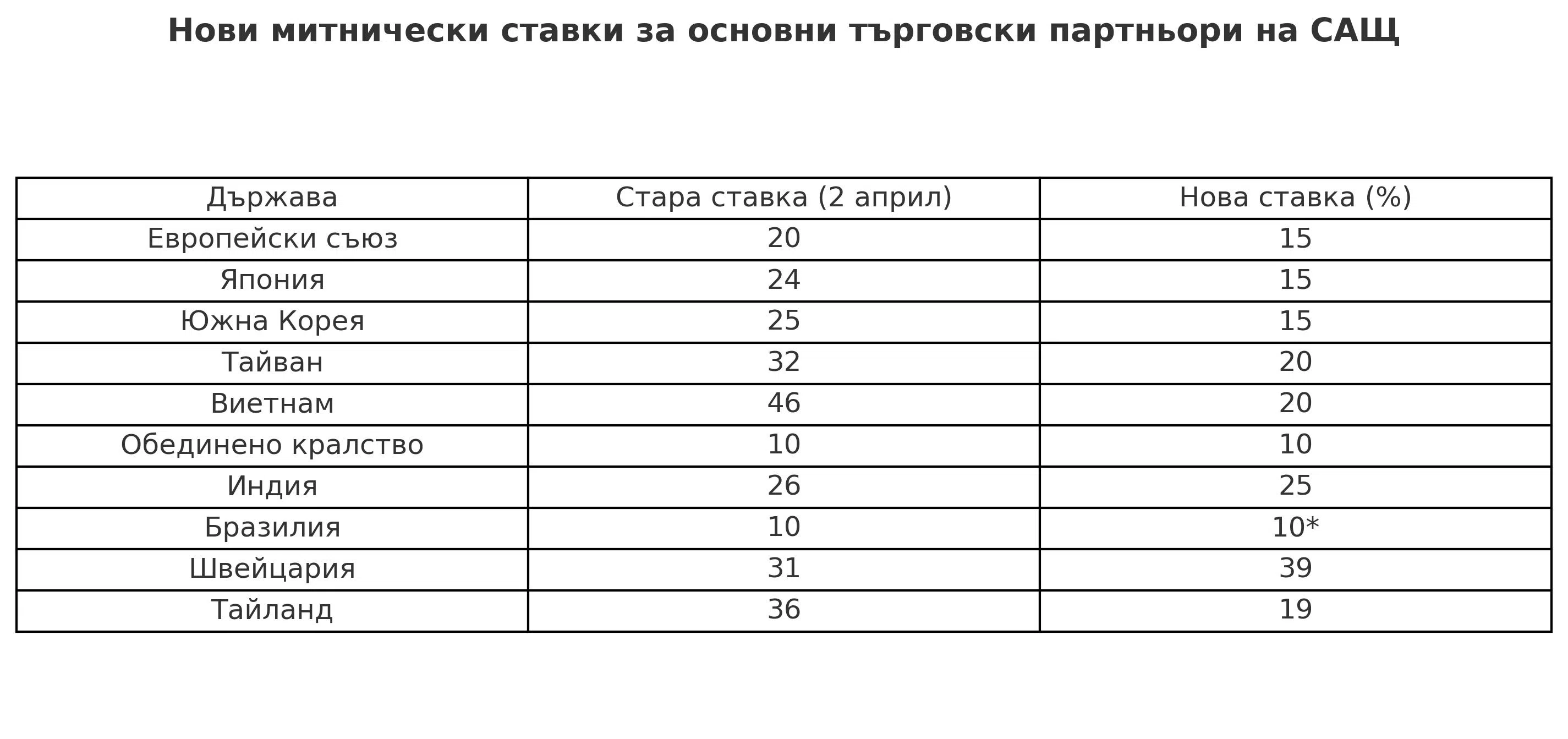 Ключови експортьори към Съединени американски щати, в това число Тайван – най-важният производител на полупроводници в света – ще бъдат обложени с високи нови мита. Тръмп също по този начин усилва митата за Канада – съдружник и главен търговски сътрудник – до 35%. Индия е наранена с 25%, а Швейцария с цели 39%.