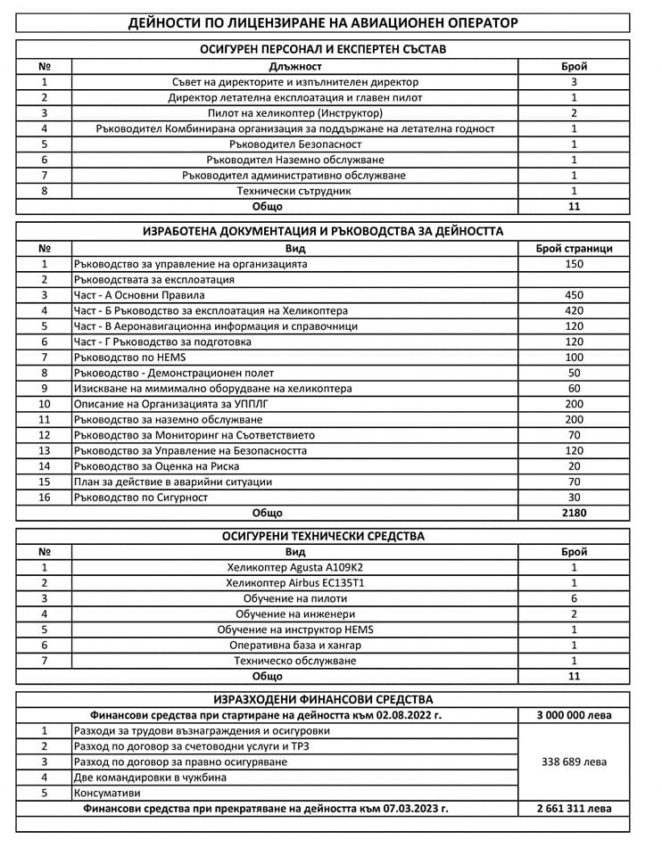 - Осигурихме нужния експертен и дипломиран личен състав (пилоти, инженери, наземен състав). Общо 11 индивида.