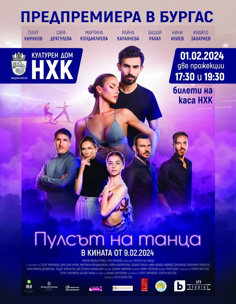 От през днешния ден може да си купите билети за новия български филм „ Пулсът на танца “. Това е първият филм в България, отдаден на спортните танци. Срещата с бургазлии, които първи в страната ще могат да го гледат, е на 1 февруари в НХК. Поради упования огромен интерес са планувани две прожекции - от 17.30 и 19.30 часа. След тях ще има полемика с актьорите.