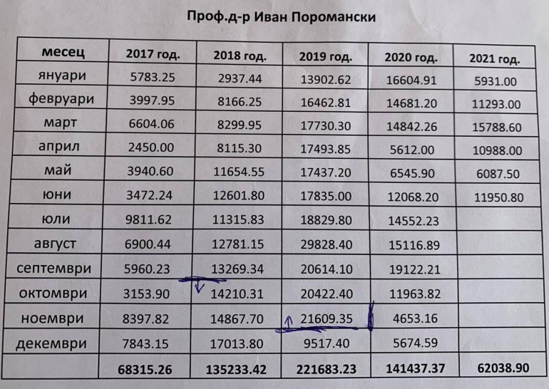От документа излиза наяве, че той е получавал трикратно по-висока заплата даже от шефа проф. Балтов, като даже той самичък е определял размера ѝ. Порочната му процедура е била стопирана от проф.Балтов преди 2 години. Поромански е прибирал в някои месеци по 29 000 лв., а за 2019 година с написаните от самия него бонуси е взимал над 221 000 лева За 2017 година той е взел общо малко над 68 хиляди лева, а през 2018 година взима двойно повече. През цялата 2019 година има големи бонуси под формата на ДМС и месеци подред взима над 20 000 лева, като през август размерът на сумата доближава 29 000 лева. по този начин общо за цялата 2019 година е приходът му възлиза на 221 683 лева Малко след намесата на управлението стартира да взима по-малки суми, колкото взимат и останалите шефове на клиники.