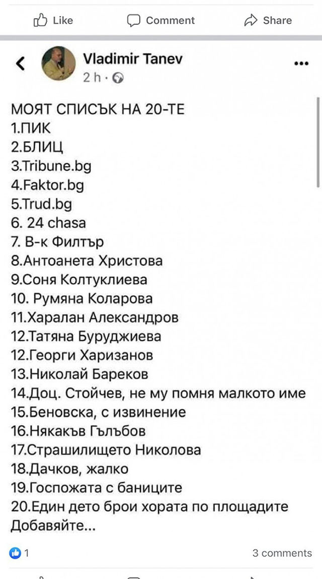 Владимир Танев, клетият, и той направил някакъв лист - по Google ли, по Шесто на Шесто ли, по дъното на дамаджаната ли… не е ясно. Аз съм там на 9-то място. Неотдавна отново беше направил лист: с най-влиятелните персони във Facebook - тогава бях на по-предно място.
