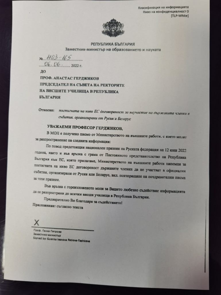 В ОБРАЗОВАТЕЛНОТО МИНИСТЕРСТВО - МАЛОУМИЕ, БЯСНА РУСОФОБИЯ И ПОЗОРНА ТАЛИБАНЩИНА. Прочетете това писмо - предлага се на нашите висши образователни заведения и университетски среди да не поздравяват своите съветски сътрудници за 12 юни - националния празник на Русия... Безумието, което идва от Брюксел, приема застрашителни размери! Следващата стъпка е: българите с съветски дипломи да не се признават за висшисти, да ги уволняват от работа, а най-добре да им сложат по една наложителна петолъчка на ревера (като жълтите звезди на евреите едно време)...