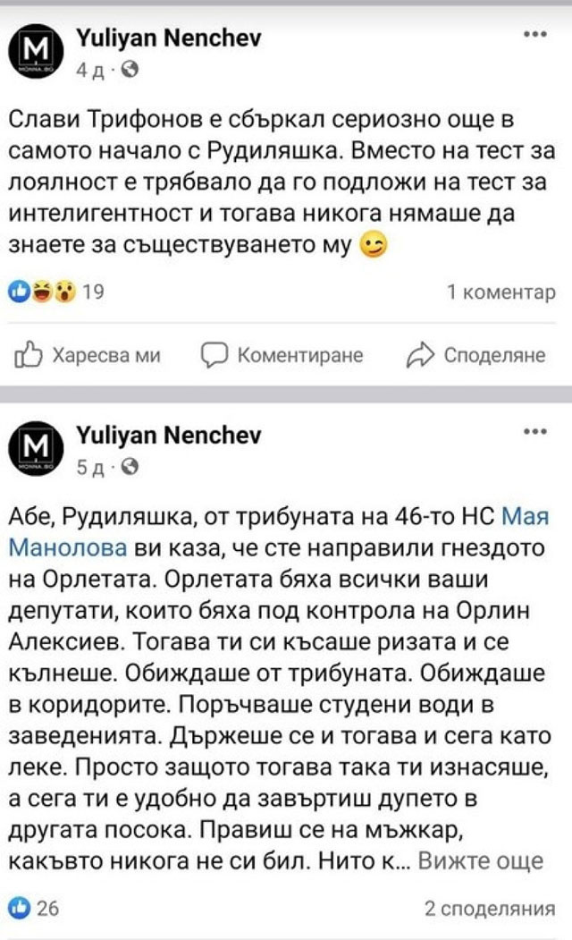 Абе, Рудиляшка, от трибуната на 46-то Народно събрание Мая Манолова ви сподели, че сте създали гнездото на Орлетата. Орлетата бяха всички ваши депутати, които бяха под контрола на Орлин Алексиев. Тогава ти си късаше ризата и се кълнеше. Обиждаше от трибуната. Обиждаше в коридорите. Поръчваше студени води в заведенията. Държеше се и тогава и в този момент като петно. Просто тъй като тогава по този начин ти изнасяше, а в този момент ти е комфортно да завъртиш дупето в другата посока. Правиш се на мъжага, какъвто в никакъв случай не си бил.