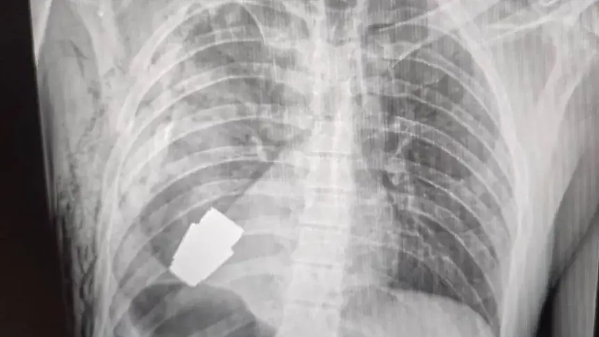 Снимки преди и след на фейсбук страницата на здравната работа на въоръжените сили на Украйна,показват рентгенова фотография на експлозив,близо до сърцето на военнослужещия и друга на хирурга, който държи окървавеното устройство.
