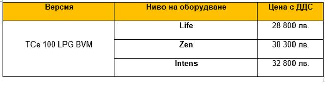 Друга мощна страна на тази фабрична интеграция е, че размерът на багажника над пода остава неизменен (резервоарът за пропан-бутан е инсталиран на мястото на аварийното колело). Renault CLIO се предлага в България от март на цени от 28 800 лева с Данък добавена стойност.