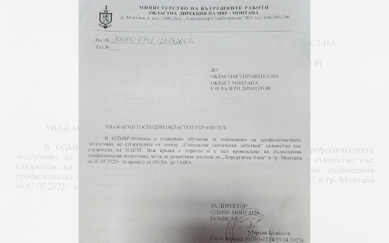 Единият документ е писмо от шефа на ОД на Министерство на вътрешните работи - Монтана до регионалния шеф, с което осведоми за образованието, в което ще вземат участие чиновници на " Национална организация за надзор на предпазените територии ".
