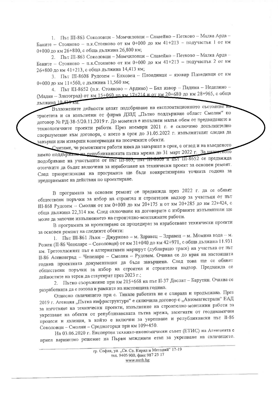 „ До момента е изпълнен дребен размер от плануваните в софтуерните планове работи. През ноември 2021 година е подписано в допълнение съглашение към контракта, с което в период до 31.05.2022 година изпълнителят следва да приключи или извърши консервация на посочените обекти. Считаме, че ремонтите работи няма да завършат в период, с оглед и на въведеното зимно поддържане на републиканската пътна мрежа до 31 март 2022 г.