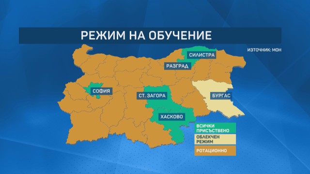 В тези 5 области всички паралелки ще са на учебно заведение присъствено. Мерките се облекчават и в Бургас, само че не за всички деца. Останалите области са на ротация. Режимът на образование по региони е в детайли написан на страницата на просветното министерство.
