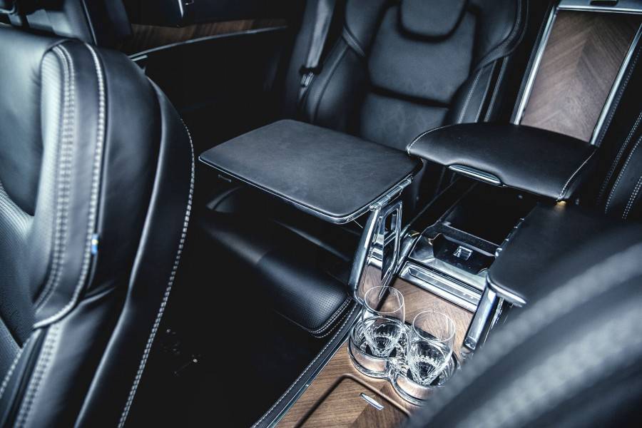 На централния подлакътник има огромно поделение, облицовано с мека тъкан. Между задните седалки са планувани гнезда за зареждане на телефон и други устройства. От двете страни на междинната подпора има две плъзгащи се масички като в аероплан, които единствено с едно придвижване се сгъват автоматизирано и се прибират, в случай че няма да бъдат употребявани. Те са дребни, само че здрави с железна рамка и кръгли поставки за чаши. Говорейки за питиета, зад конзолата и под високоговорителя Bowers & Wilkins ще откриете просторна кутия с регулируема температура. Можете да употребявате това пространство с цел да затопляте или охлаждате храни и питиета. Има и място за две бутилки шампанско. За напитките дизайнерите на Volvo са прибягнали до услугите на майсторите на шведския кристал Orrefors, които от своя страна са създали специфични чаши. Те нямат столче, а единствено стъбълце, за което чашите са надеждно закрепени към интелигентните поставки пред конзолата или в хладилното поделение.