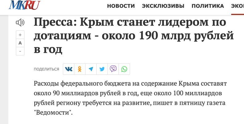 Крим ще стане водач по дотации - към 190 милиарда рубли годишно (около 2,5 милиарда евро). Вестник " Московский комсомолец ", 11 юли 2014 година
