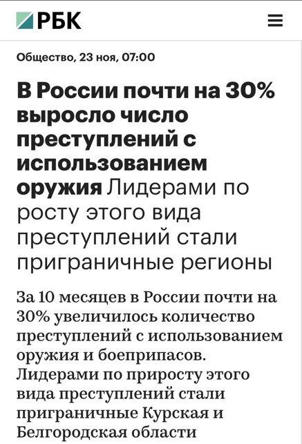 „ В Русия броят на закононарушенията с оръжие се е нараснал с съвсем 30%. Лидери в растежа на този тип престъпност са граничните региони (с Украйна) “, написа РБК.