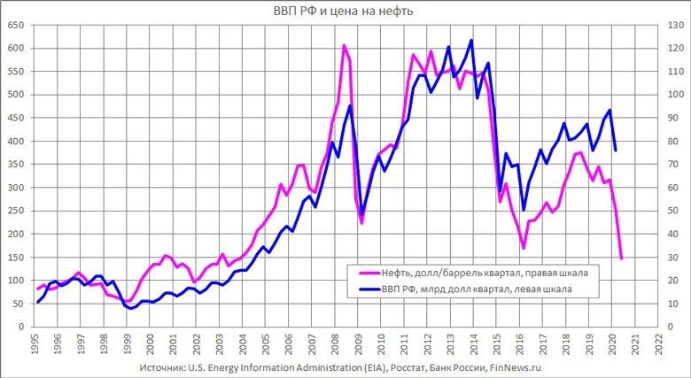 Графика, показваща зависимостта на Брутният вътрешен продукт на Русия от цената на нефта.