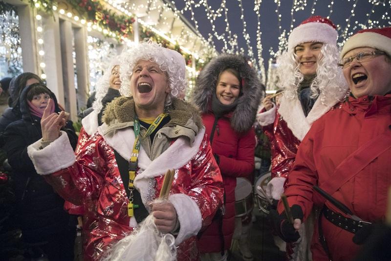 © БТАРусия Облечени като Дядо Мраз хора танцуваха в ритъма на самба на предновогодишно празненство. Бразилските ритми обаче в действителност прозвучаха в Москва.